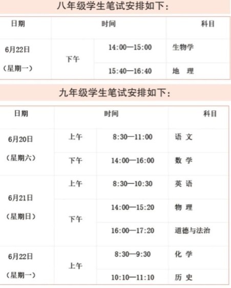九年级学生笔试科目:语文、数学、英语、物理、道德与法治、化学、历史,共7科7卷。其中,道德与法治实行开卷笔试,其他科目均为闭卷笔试。各科目均为一卷制,满分值及考试时长分别为:语文120分,考试时长150分钟;数学120分,考试时长120分钟;英语120分(其中听力30分),考试时长120分钟;物理80分,考试时长80分钟;道德与法治80分,考试时长80分钟;化学60分,考试时长60分钟;历史60分,考试时长60分钟。